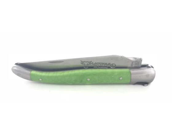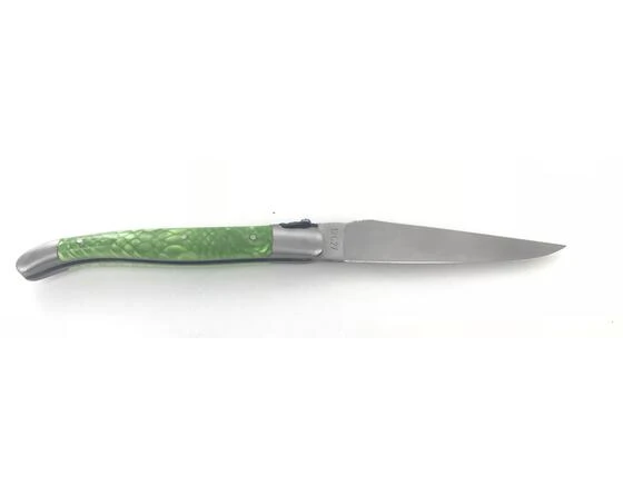 Spring made in 3mm thick stainless Steel Z20C13. A solid bladestop is provided on all of our springs, that shall keep a long time the edge of the blade. The traditional bee is solid, and forged into the spring. The spring and the bee are then hand-chased with a file.