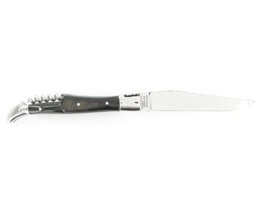 Spring made in 3mm thick stainless Steel Z20C13. A solid bladestop is provided on all of our springs, that shamm keep a long time the edge of the blade. The traditional bee is solid, and forged into the spring. The spring and the bee are then hand-chased with a file outside and inside.