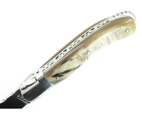 The spring with its lock-back system is made from a 3mm thick stainless Steel Z20C13. A solid bladestop is provided on all of our springs, that shall keep a long time the edge of the blade. The traditional bee is solid, and forged into the spring. The spring and the bee are then hand-chased with a file.