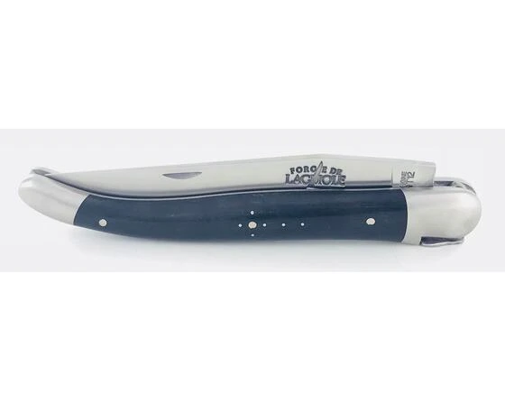 Each knife takes several hours or even days to manufacture. Over 40 successive steps are needed to realize one. The quality of the finish, the strength of the blade and the spring, the thickness of the bolsters and plates, as well as the accuracy of the calibration are the elements that contribute to its longevity. Forge de Laguiole integrates all these manufacturing steps. The blades are forged and tempered on-site at Laguiole. Each model is assembled and shaped by the same cutler: One man, one knife. The shape of the knife must respect the general outline determined by the cutlers of the nineteenth century. Today that view inspires many designers. Forge de Laguiole manufacture offers several types of forged steels to satisfy lovers of traditional patterns and those of more modern knives. Carbon steel is the oldest. Appreciated by collectors, it retains great cutting ability as it wears down slowly and changes color over the years. The new T12 stainless steel was designed specifically for the Forge and holds its luster and edge superbly.