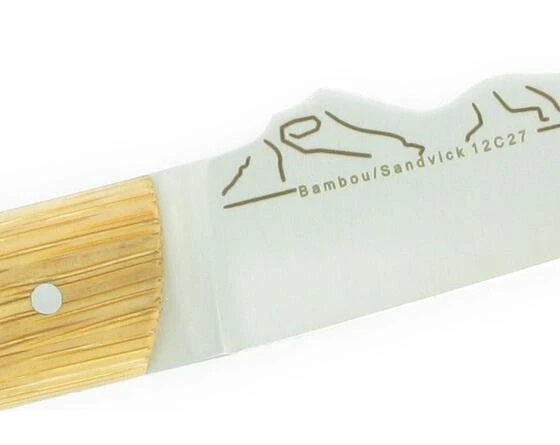 Brin d’ Auvergne Blade representing the “Chaîne des Puys” Bamboo handle – Natural Wood 12C27 Sandvick Blade Brin d’ Auvergne is the creation of the cutlery K SABATIER, emblematic of a French area. Artisanal know-how, nature and the gastronomy are combined to give the inspiration. The blade becomes a support of the graphic expression, mixed between silhouette and playing reliefs of the “Chaîne des Puys”. The handle, as for him, is treated in opposition of forms by a sobriety quasi minimalist, in order to give more impact with the dominating natural element : our Puy de Dôme. Quality Guarantee : the signature ” K Sabatier” , more than 150 years of cutlery history to Thiers. steel : sandvick 12C27, hardness 58/59 Rockwell C. Artisanal Emouture and polishing. Creation: Philippe BOURNILHAS