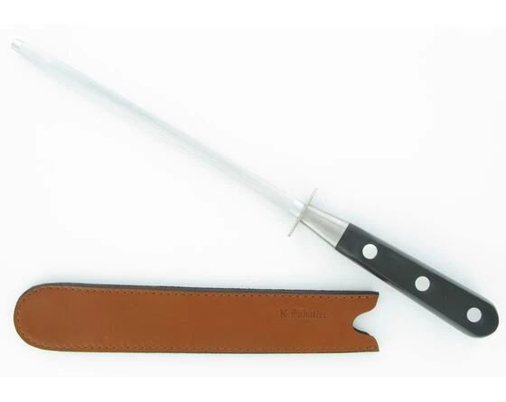 The sharpening rod, manufactured in high-carbon steel, is quenched providing much greater hardness than knives.