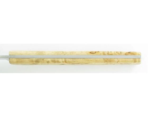 Brin d’ Auvergne Blade representing the “Chaîne des Puys” Birch Wood handle – Natural Wood 12C27 Sandvick Blade Brin d’ Auvergne is the creation of the cutlery K SABATIER, emblematic of a French area. Artisanal know-how, nature and the gastronomy are combined to give the inspiration. The blade becomes a support of the graphic expression, mixed between silhouette and playing reliefs of the “Chaîne des Puys”. The handle, as for him, is treated in opposition of forms by a sobriety quasi minimalist, in order to give more impact with the dominating natural element : our Puy de Dôme. Quality Guarantee : the signature ” K Sabatier” , more than 150 years of cutlery history to Thiers. steel : sandvick 12C27, hardness 58/59 Rockwell C. Artisanal Emouture and polishing. Creation: Philippe BOURNILHAS