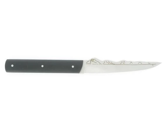 Brin d’ Auvergne Blade representing the “Chaîne des Puys” Black Plastic Handle (Ebony Color) For WASHING-MACHINE 12C27 Sandvick Blade Brin d’ Auvergne is the creation of the cutlery K SABATIER, emblematic of a French area. Artisanal know-how, nature and the gastronomy are combined to give the inspiration. The blade becomes a support of the graphic expression, mixed between silhouette and playing reliefs of the “Chaîne des Puys”. The handle, as for him, is treated in opposition of forms by a sobriety quasi minimalist, in order to give more impact with the dominating natural element : our Puy de Dôme. Quality Guarantee : the signature ” K Sabatier” , more than 150 years of cutlery history to Thiers. steel : sandvick 12C27, hardness 58/59 Rockwell C. Artisanal Emouture and polishing. Creation: Philippe BOURNILHAS