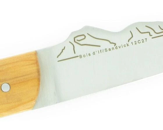 Brin d’ Auvergne Blade representing the “Chaîne des Puys” Yew Wood handle – Natural Wood 12C27 Sandvick Blade Brin d’ Auvergne is the creation of the cutlery K SABATIER, emblematic of a French area. Artisanal know-how, nature and the gastronomy are combined to give the inspiration. The blade becomes a support of the graphic expression, mixed between silhouette and playing reliefs of the “Chaîne des Puys”. The handle, as for him, is treated in opposition of forms by a sobriety quasi minimalist, in order to give more impact with the dominating natural element : our Puy de Dôme. Quality Guarantee : the signature ” K Sabatier” , more than 150 years of cutlery history to Thiers. steel : sandvick 12C27, hardness 58/59 Rockwell C. Artisanal Emouture and polishing. Creation: Philippe BOURNILHAS