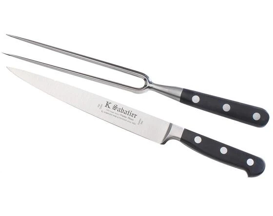 The whole knife and fork is forged in a single mass of stainless steel. The steel Z50C13, Rockwell 54-56 HRC, is tempered and polished crosswise to produce a high-quality tool, great cutting power, cutting hardness and balance.