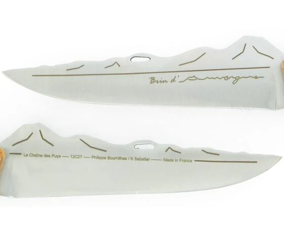 Brin d’ Auvergne Blade representing the “Chaîne des Puys” Box Wood handle – Natural Wood 12C27 Sandvick Blade Z20 Spring System Total dimension: 20,3 cm Length Blade: 9 cm Brin d’ Auvergne is the creation of the cutlery K SABATIER, emblematic of a French area. Artisanal know-how, nature and the gastronomy are combined to give the inspiration. The blade becomes a support of the graphic expression, mixed between silhouette and playing reliefs of the “Chaîne des Puys”. The handle, as for him, is treated in opposition of forms by a sobriety quasi minimalist, in order to give more impact with the dominating natural element : our Puy de Dôme. Quality Guarantee : the signature ” K Sabatier” , more than 150 years of cutlery history to Thiers. steel : sandvick 12C27, hardness 58/59 Rockwell C. Artisanal Emouture and polishing. Creation: Philippe BOURNILHAS