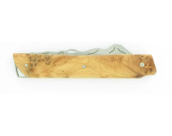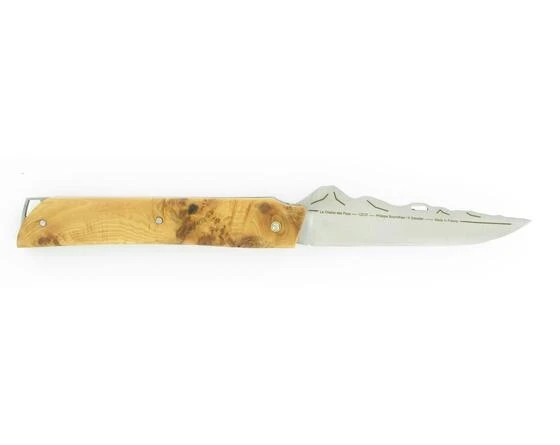 Brin d’ Auvergne Blade representing the “Chaîne des Puys” JUNIPER TREE handle – Natural Wood 12C27 Sandvick Blade Z20 Spring System Total dimension: 20,3 cm Length Blade: 9 cm Brin d’ Auvergne is the creation of the cutlery K SABATIER, emblematic of a French area. Artisanal know-how, nature and the gastronomy are combined to give the inspiration. The blade becomes a support of the graphic expression, mixed between silhouette and playing reliefs of the “Chaîne des Puys”. The handle, as for him, is treated in opposition of forms by a sobriety quasi minimalist, in order to give more impact with the dominating natural element : our Puy de Dôme. Quality Guarantee : the signature ” K Sabatier” , more than 150 years of cutlery history to Thiers. steel : sandvick 12C27, hardness 58/59 Rockwell C. Artisanal Emouture and polishing. Creation: Philippe BOURNILHAS