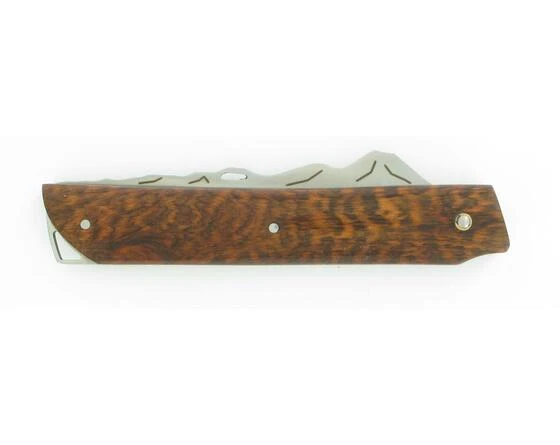 Brin d’ Auvergne Blade representing the “Chaîne des Puys” SNAKE Wood handle – Natural Wood 12C27 Sandvick Blade Z20 Spring System Total dimension: 20,3 cm Length Blade: 9 cm Brin d’ Auvergne is the creation of the cutlery K SABATIER, emblematic of a French area. Artisanal know-how, nature and the gastronomy are combined to give the inspiration. The blade becomes a support of the graphic expression, mixed between silhouette and playing reliefs of the “Chaîne des Puys”. The handle, as for him, is treated in opposition of forms by a sobriety quasi minimalist, in order to give more impact with the dominating natural element : our Puy de Dôme. Quality Guarantee : the signature ” K Sabatier” , more than 150 years of cutlery history to Thiers. steel : sandvick 12C27, hardness 58/59 Rockwell C. Artisanal Emouture and polishing. Creation: Philippe BOURNILHAS