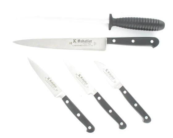 The whole knives are forged in a single mass of stainless steel. The steel Z50C13, Rockwell 54-56 HRC, is tempered, ground and polished crosswise to produce a high-quality tool, great cutting power, cutting hardness and balance. POM handles are manually set and mounted on the tang using three through rivets. From forging to packaging, we garantee that all our operations are performed in the Thiers region in FRANCE by skilled workers to ensure a professional quality craft finish.